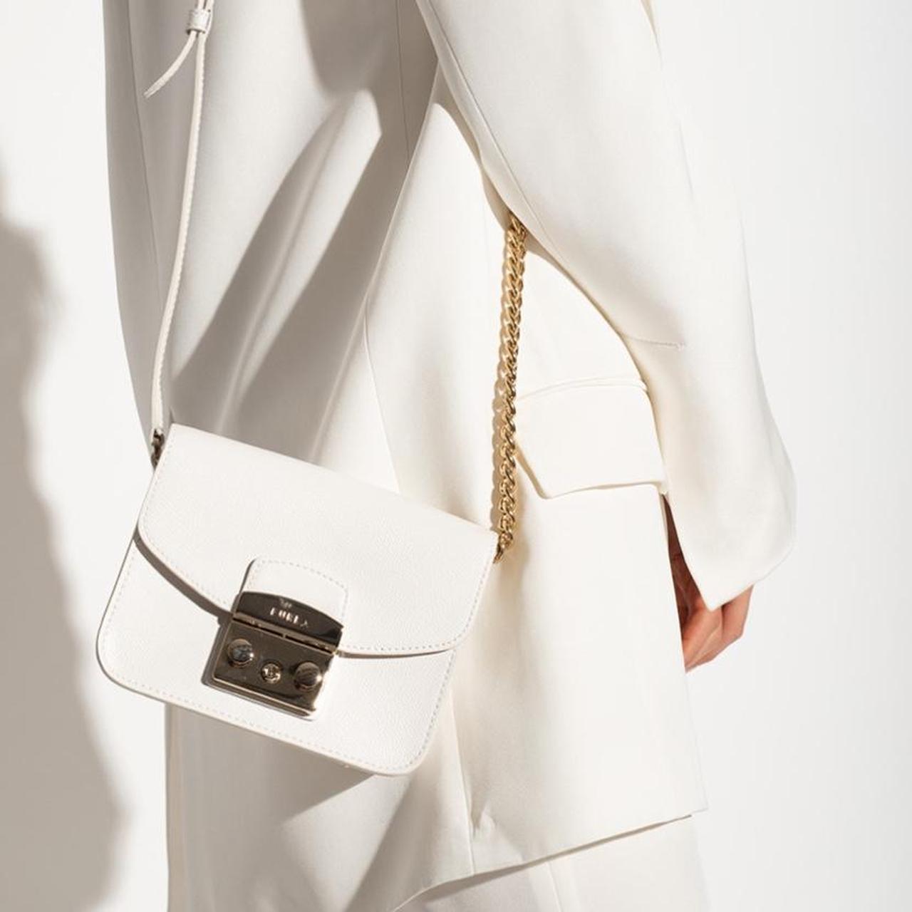 The metal closure of the signature Furla Metropolis mini crossbody bag in calfskin is a decorative, highly recognizable element.One open pocket is available on the inside. Metal feet protect the bottom.This bag can be carried as a crossbody bag or over the shoulder; thanks to its removable shoulder-strap in metal chain.