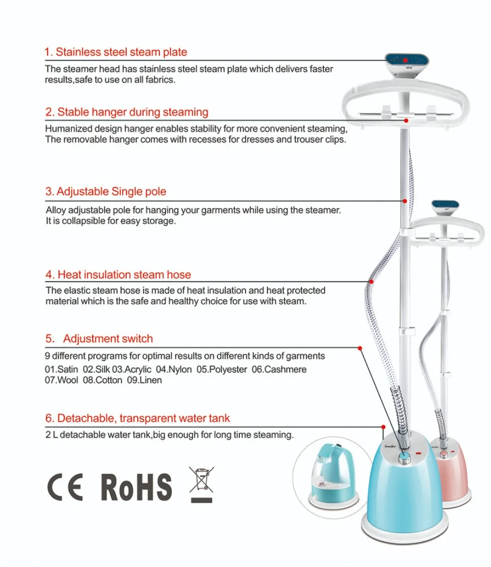 * 220-240V, 50/60Hz, 2000W * 2 vapor level * Water tank capacity: 2 liters * Powerful continuous steam with up to 35 g/min of steam * Steam start time 45 seconds, fast wrinkle removal